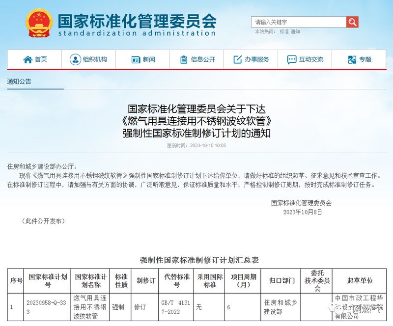 另外關(guān)于《燃?xì)庥镁哌B接用不銹鋼波紋軟管》強(qiáng)制性國家標(biāo)準(zhǔn)制修訂動態(tài)